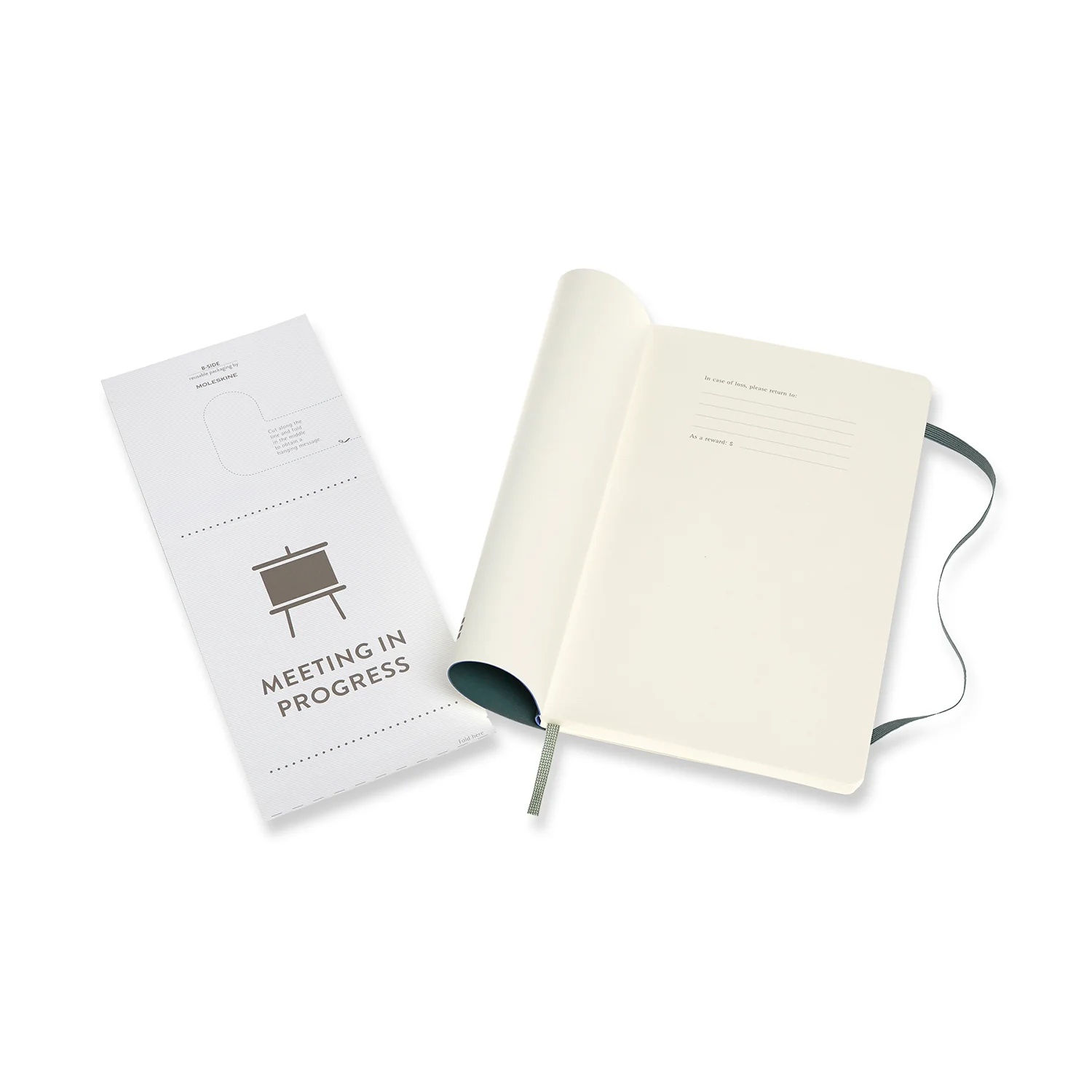 This Moleskine Professional Notebook has a soft cover with rounded corners, a ribbon bookmark, an elastic closure and a double expandable inner pocket in cardboard and cloth. There are 240 acid-free numbered pages and the last 8 are not numbered and are detachable. The notebook comes with a sheet of adhesive tabs and adhesive labels for spine and/or cover.